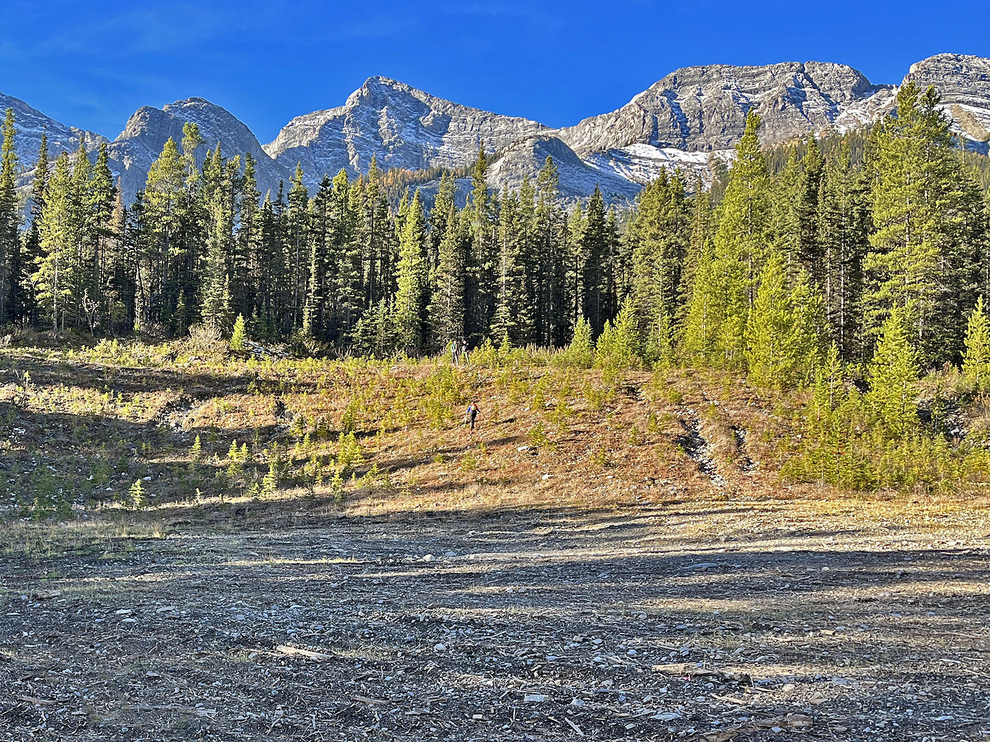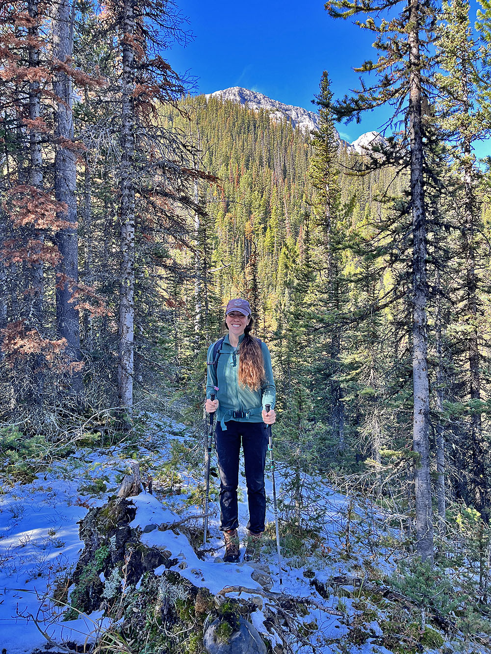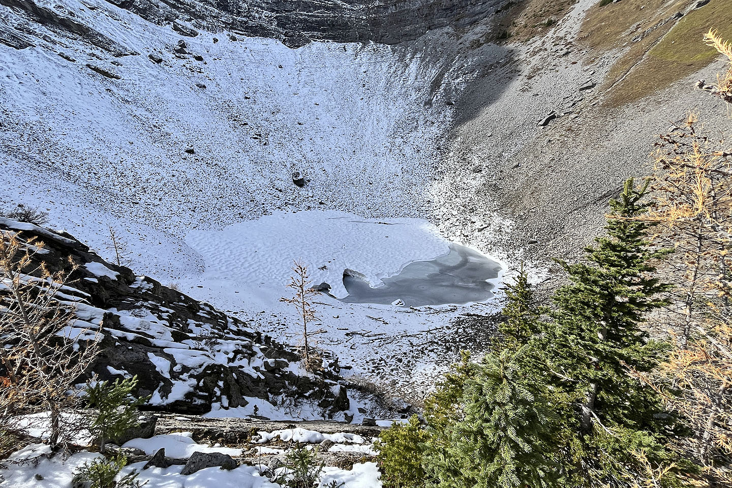 From a rocky ridge above a frozen tarn in a deep cirque, we viewed a knoll tantalisingly close. We hiked up a glade and passed through trees following a goat track. The path led to a low cliff band which we easily scrambled over. Then we hiked up a steep, grassy slope to the summit. Goat Pond and Spray Lakes Reservoir spread out below us, while familiar mountains rose above them. A fire pit indicated we weren’t the first to reach the top of what we called Old Goat Knoll.