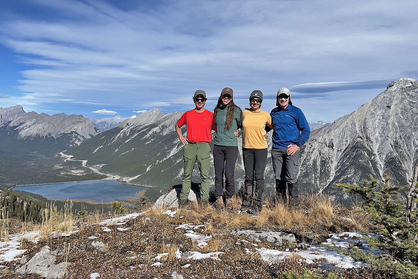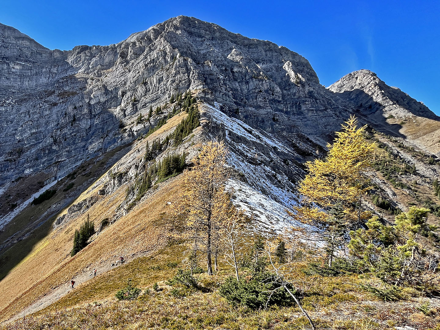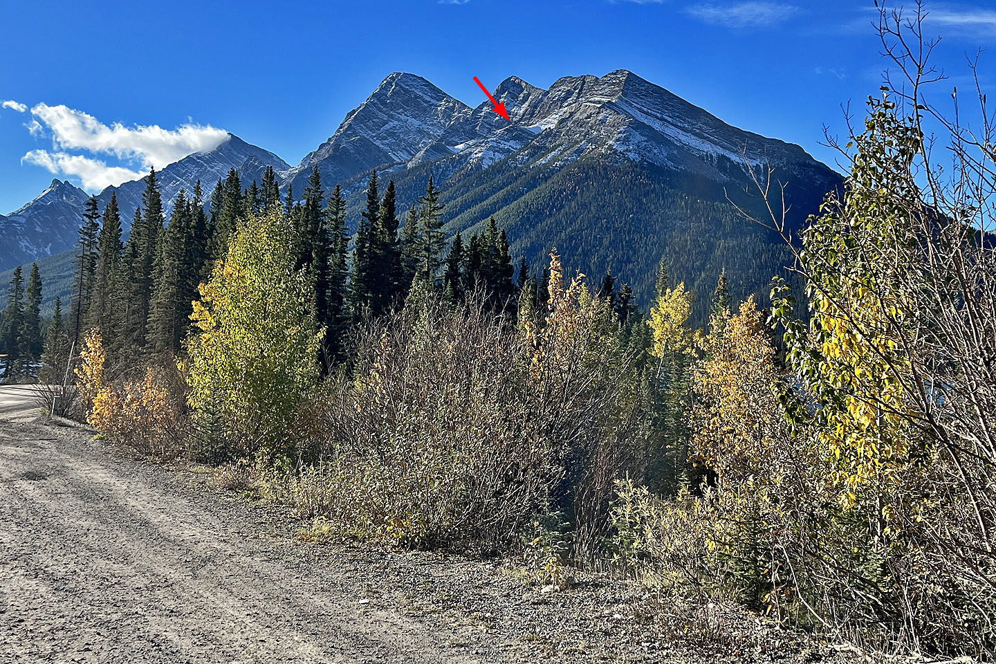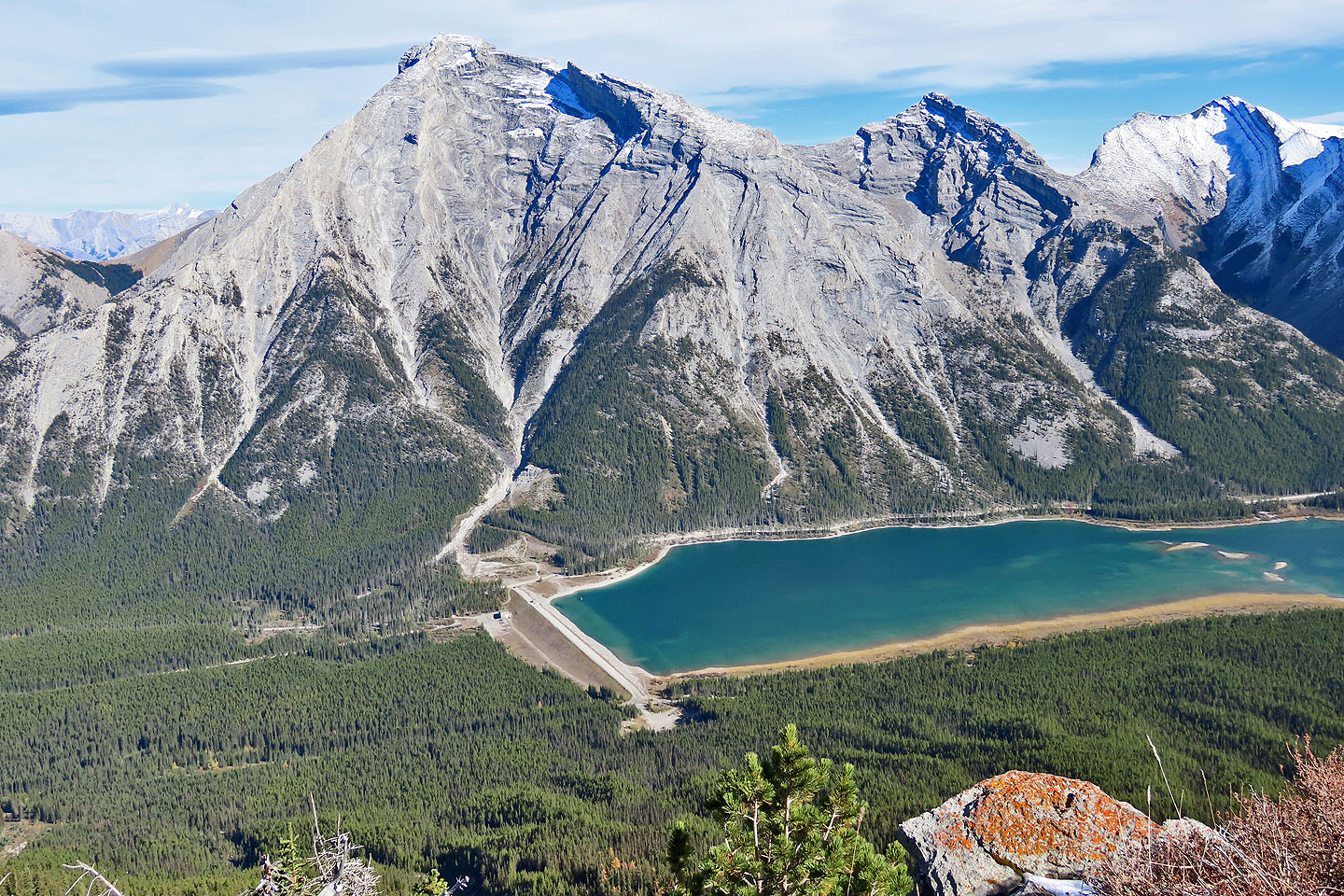 From a rocky ridge above a frozen tarn in a deep cirque, we viewed a knoll tantalisingly close. We hiked up a glade and passed through trees following a goat track. The path led to a low cliff band which we easily scrambled over. Then we hiked up a steep, grassy slope to the summit. Goat Pond and Spray Lakes Reservoir spread out below us, while familiar mountains rose above them. A fire pit indicated we weren’t the first to reach the top of what we called Old Goat Knoll.