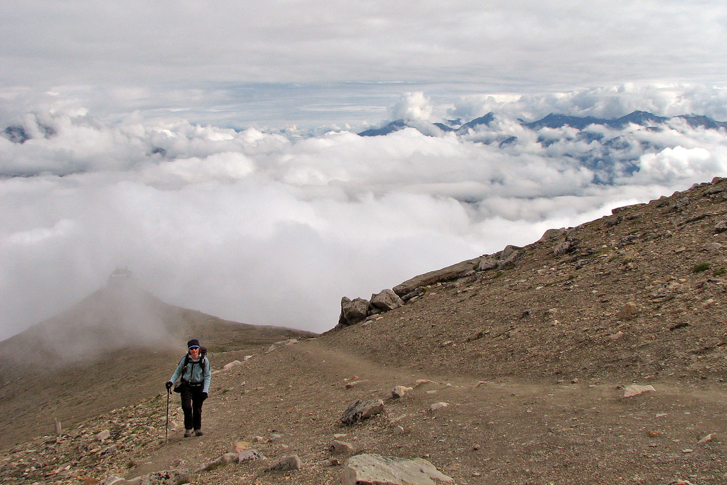 A hint of the bad weather to come appeared at the start. While riding the tram, we ascended in low cloud. We were told to be prepared for a rare treat. Because of an inversion, we would climb above the clouds. Sure enough, when we exited the tram, we were greeted with a vast plain of clouds perforated with peaks.
