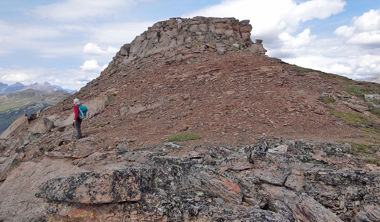 Twin Cairns is a minor ridge that rises 200 m above Sunshine Meadows. It's so slight, it's probably better to think of it as a feature rather than a ridge, hardly worthwhile given the long approach. But when a bear closure turned Zora, Becky, Dinah and me away from ascending Mount Howard Douglas, Twin Cairns was a welcomed alternative, surprisingly pleasant and interesting.