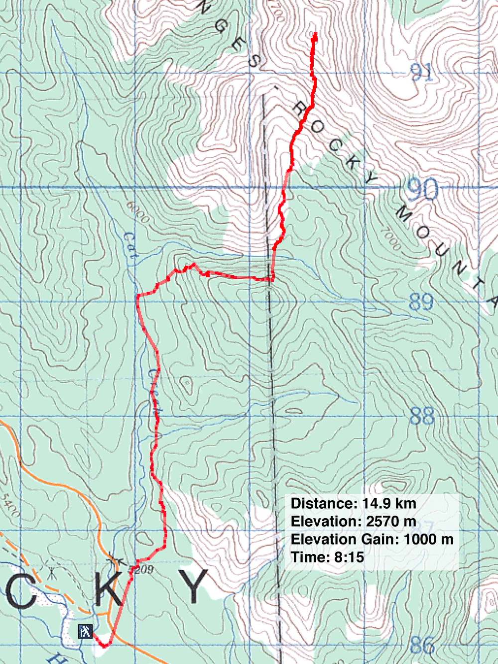 Instead of returning the same way, we dropped down the southwest side and angled back down to the valley where we had started the ascent. (Map shows our descent route.)
