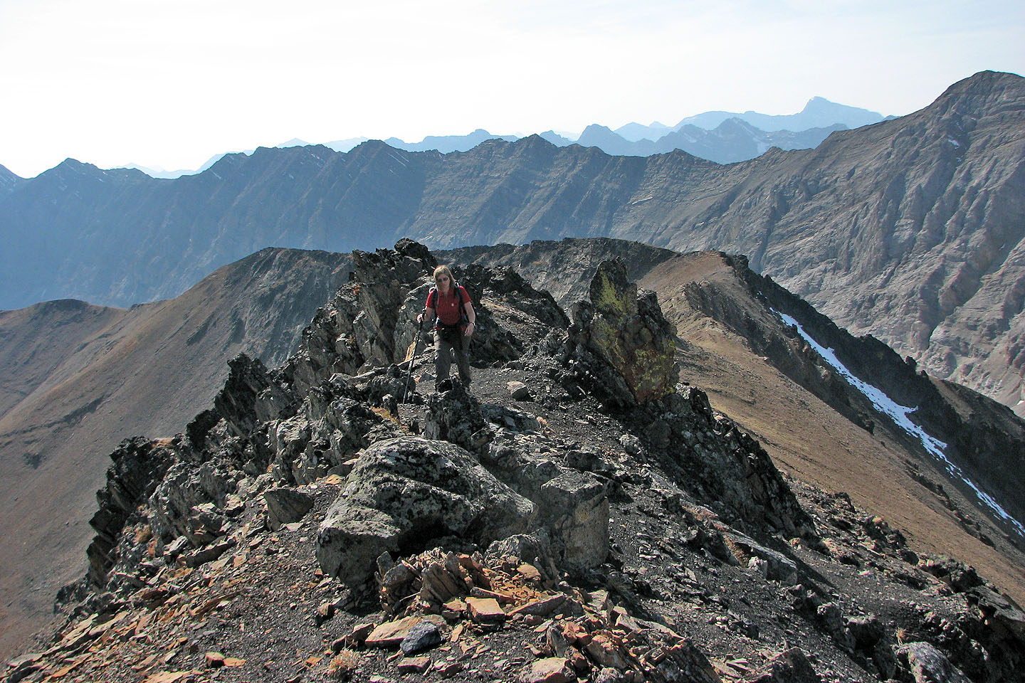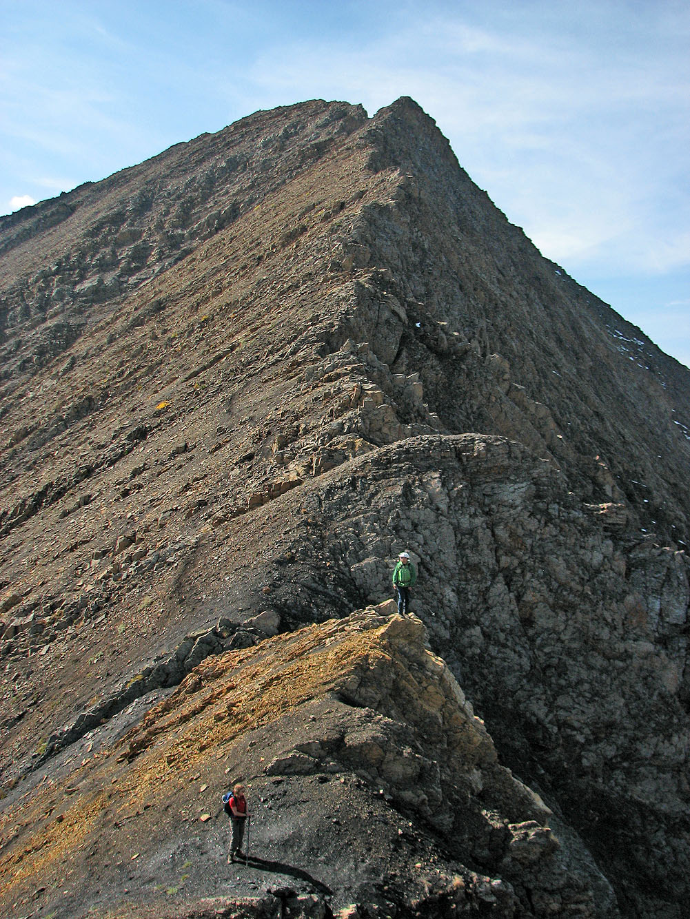 On the last day of summer, I joined Sonny and Kelly to climb a couple of minor peaks, Grizzly Ridge and Highwood Ridge. After parking at the Little Highwood Pass day-use parking lot, we hiked up to Grizzly Col. Here we left the crowds behind as we ascended the west slope of Grizzly Ridge. After reaching the ridge, we headed to the high point. Given the good trail from the col to the summit, this must be a popular destination.