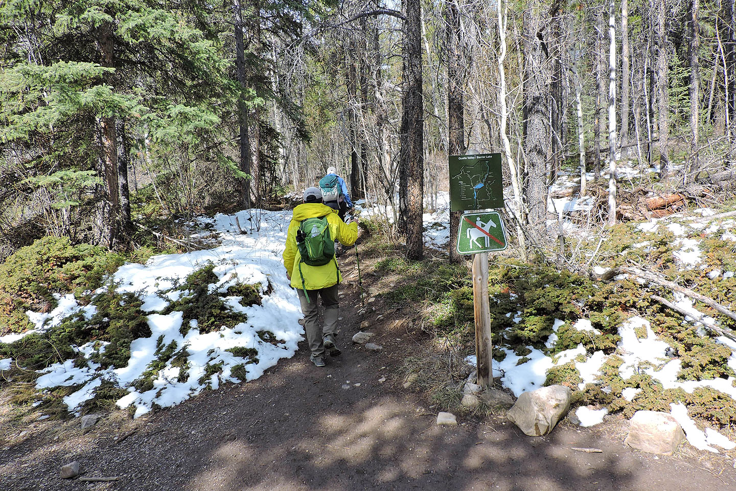 We parked at Barrier Lake and started up the broad trail. After hiking 1.4 km, we turned left at the junction to follow the lakeshore trail, a pleasant, open stretch albeit long and undulating. Just before the junction for Jewell Pass trail, we met Justin, a novice hiker. He hadn't planned on going to Jewell Pass, but we encouraged him to join us. Justin, we learned, had started hiking in January.