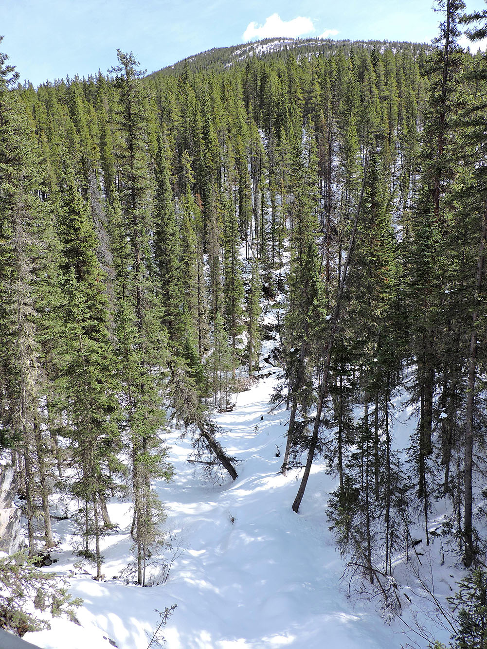 Eventually we reached Prairie View. The rocky prominence provides a satisfying mountain scene yet oddly lacks a view of the prairie. After looking around, we started down Prairie View trail. We immediately came to the crux of the trip. This steep section would be easy when dry, but we found it slick with mud and ice. After that, we sauntered down the broad path, much of it covered with slushy snow, back down the mountain. The rest of the trip was uneventful, but Dinah and I were glad to have Justin's company to pass the time as we cruised through the forest with little to see.