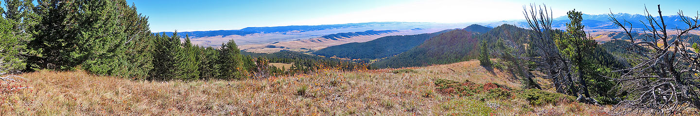 We reached the bottom of the ascent ridge and started up a broad meadow. As we climbed, we delighted in the views of the grassy valleys and rocky mountains to the west. But the same couldn't be said for the tiny summit bump half-ringed with trees. We only had a trifling view southeast of lowly Porcupine Hills.