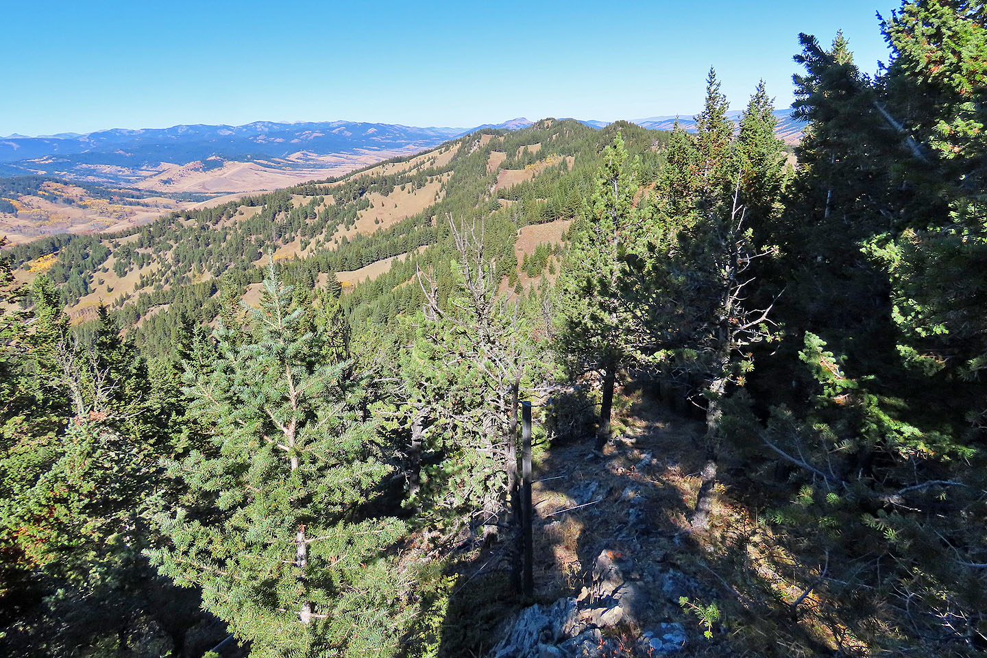 With little to see from the top, we turned our attention to the ridge traverse. We dropped down into the trees and soon came to a fence that runs along the crest. A trail parallels most of the fence, so the traverse was quick and easy.