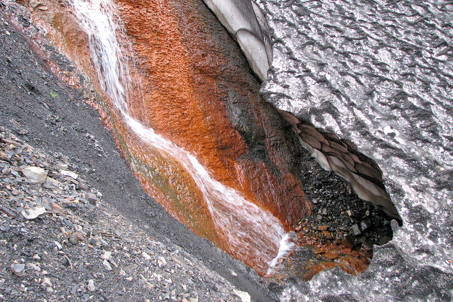 The creek bed runs between two rocks towering on either side. It's possible to scramble up the slope on the right, but we went through the rock gate. Through the gate and around the bend lay an unusual scene. Snow and debris filled a small canyon that leads to a gully. On the right was a smooth, gray rock wall; fine, black scree covered the snow on the left. Ahead, a small waterfall cascaded over orange rock and disappeared into the snow.