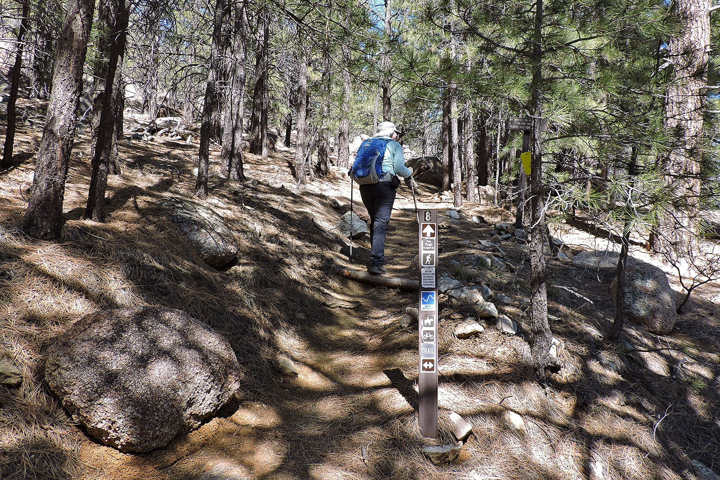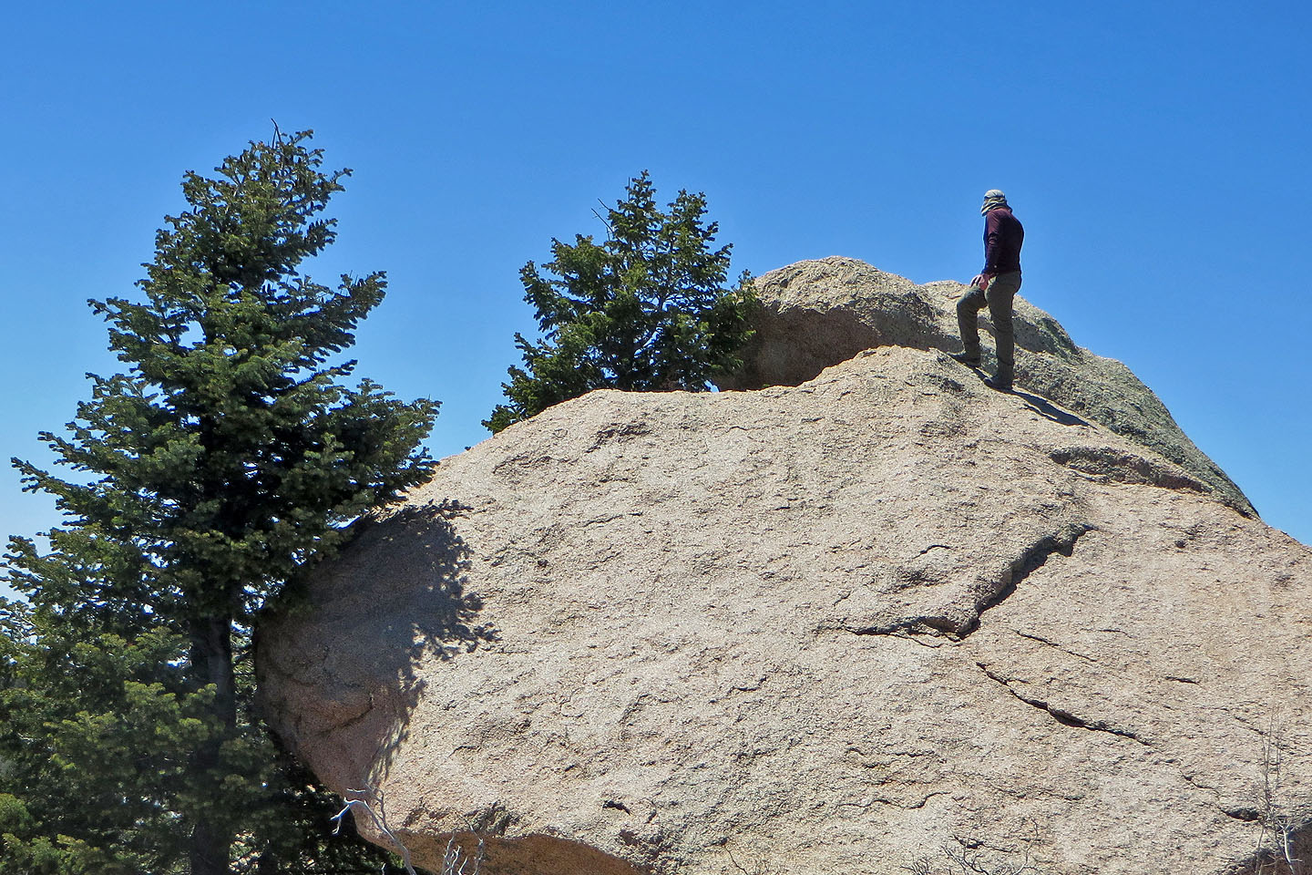 After going almost halfway around the loop, we turned onto Aspen Peak trail and hiked to Dean Peak Overlook. Continuing up the ridge after the overlook, we found a use trail that leads to a shaded level spot. We scrambled up some boulders and made our way to the summit.