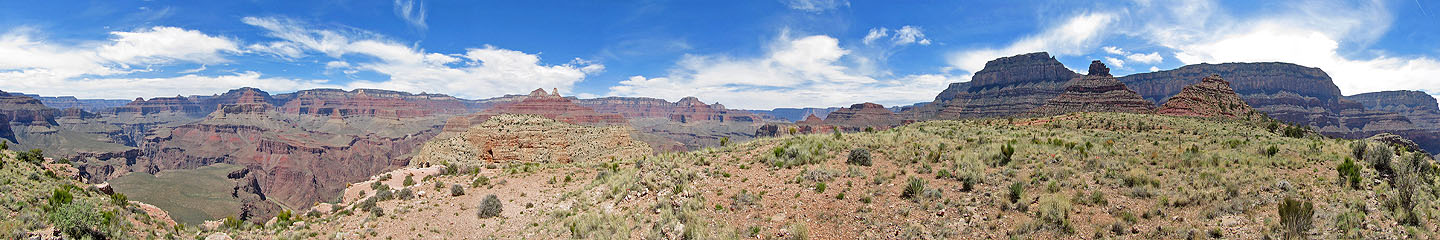 South Kaibab trail starts with a jolt, a vertiginous drop down a series of switchbacks. Then it levels off, running along the canyon side. 30 minutes after starting, I reached Ooh Aah Point. Several minutes later I dropped down to Cedar Ridge. There I left the worst of the crowds behind; the rest of my plunge down the Grand Canyon was mostly and gratefully in solitude.