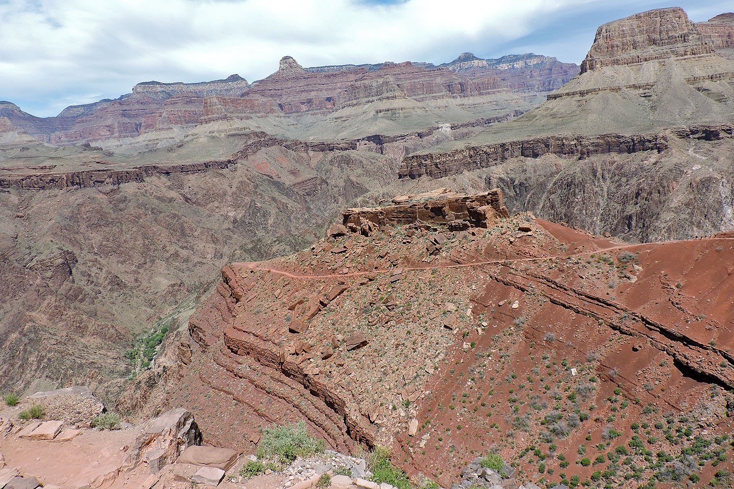 where one tips off the edge, South Kaibab trail continues down, first passing an outcrop called Train Wreck (centre) and eventually reaching the river. The green valley below is Phantom Ranch.
