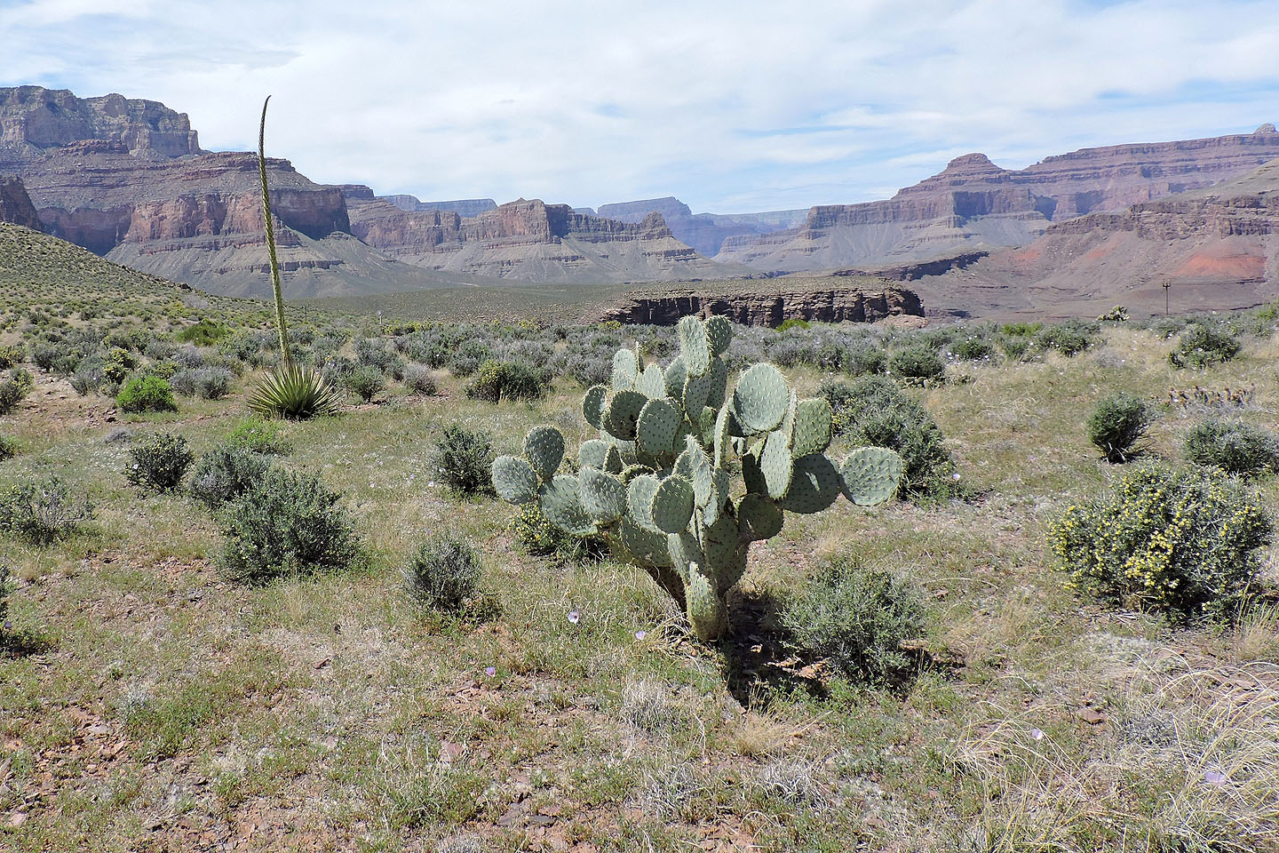 There are four stops along South Kaibab: Ooh Aah Point, Cedar Ridge, Skeleton Point and the Tipoff. After the Tipoff, the trail continues down to the Black Bridge that crosses the Colorado River. Ambitious parties can hike “rim-to-rim,” down to the river and back up to the rim, or up the other side, up the North Kaibab Trail to the North Rim. My goal was more modest: I stopped at the Tipoff. The 1000 m elevation loss would be enough for me, without dropping down another 420 m (1400 ft) to reach the bridge.