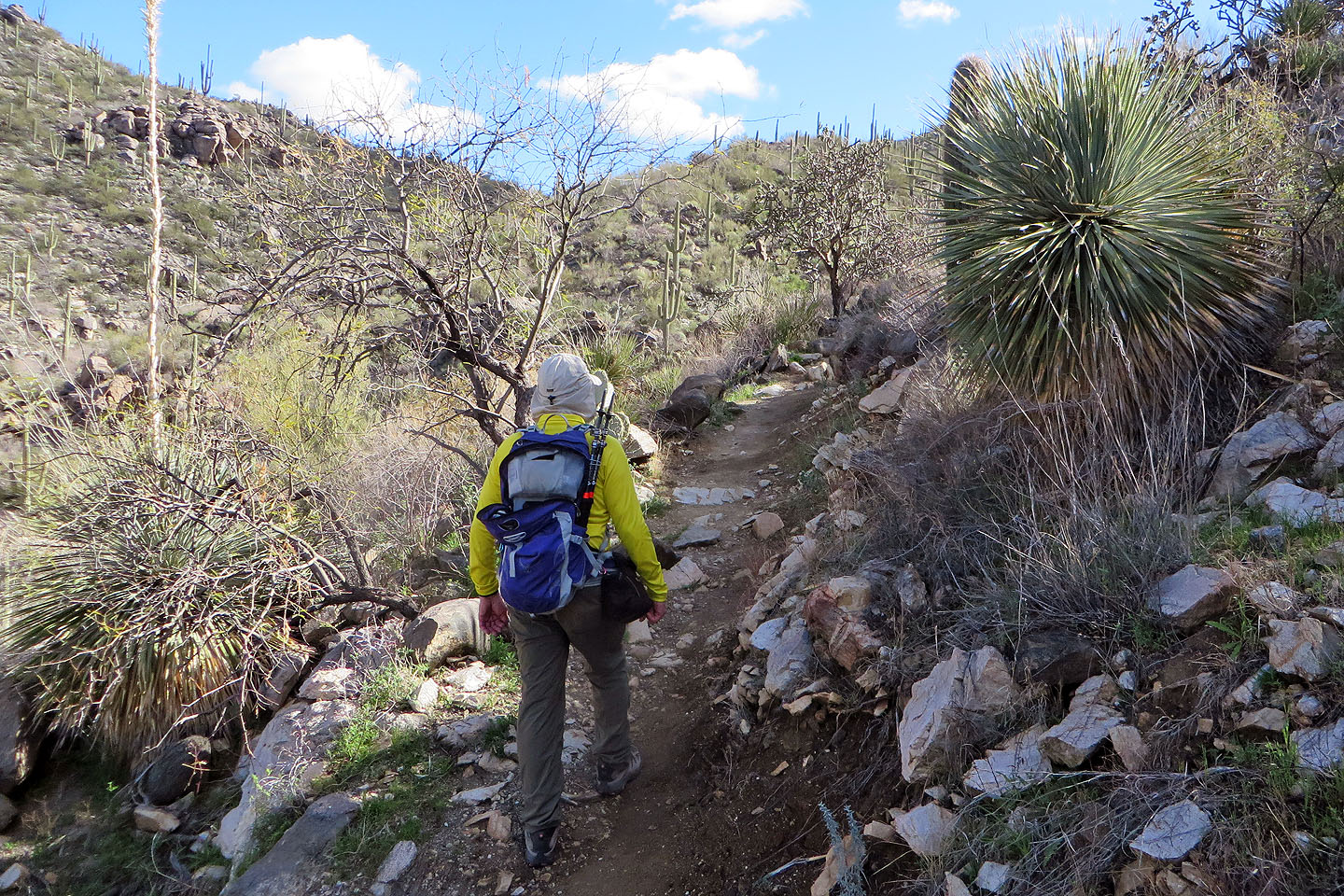 The trailhead is at the south end of the parking lot, although we reached the trail quicker by taking a shortcut. The trail follows a broad wash lined with trees and bushes. Walking down the trail, we searched for javelinas. We saw birds and rabbits and plenty of javelina tracks in the gravel bed, but no javelinas.
