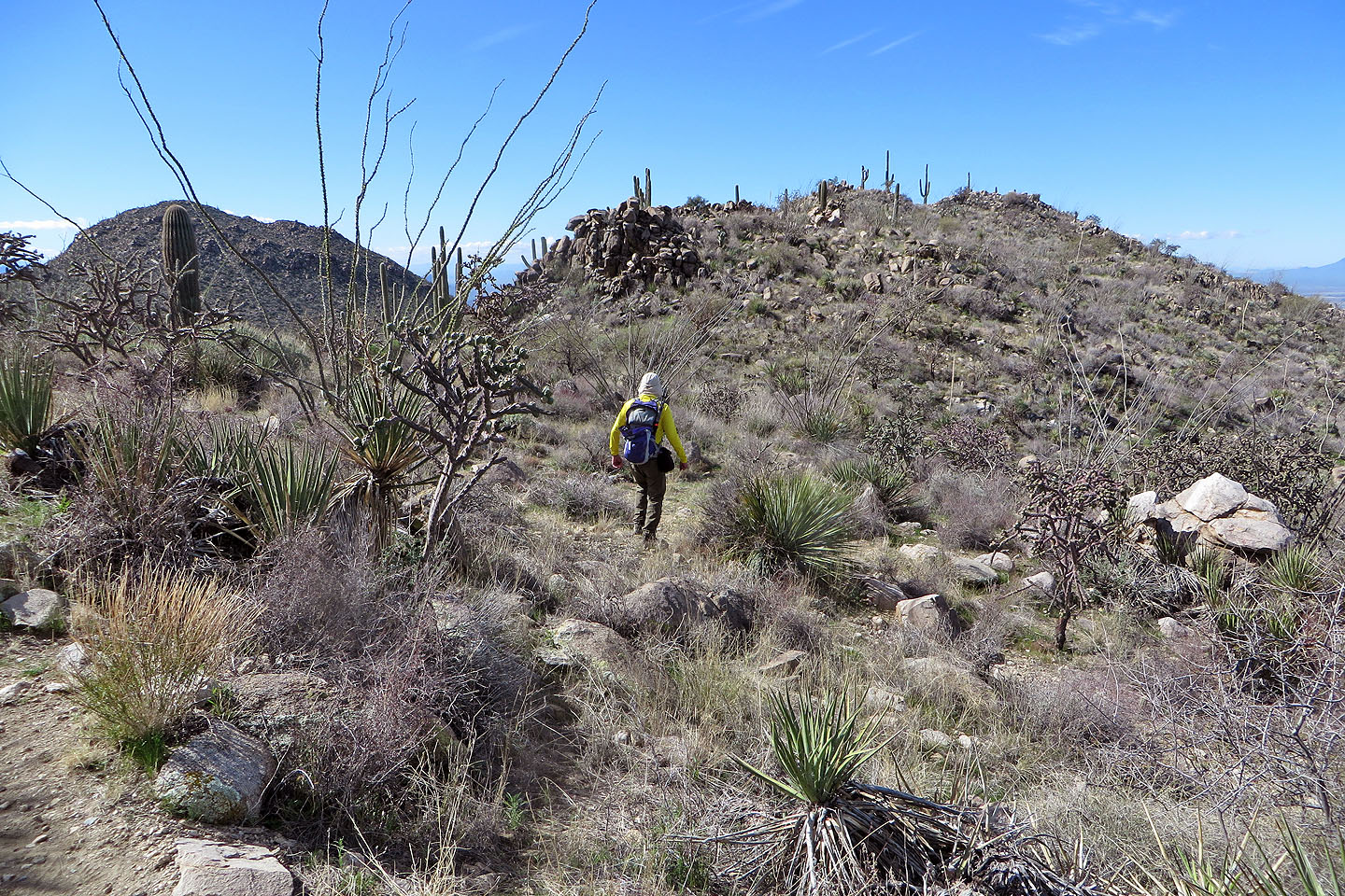 At the end of the valley, we turned on Alamo Springs Trail and started climbing. When we reached the highest point on the trail, we turned off to ascend a small hilltop. However, being surrounded by higher points, there was little to see, perhaps not worth the effort of going over rocks and pushing through scrub and cacti to reach it. We soon returned to the trail.