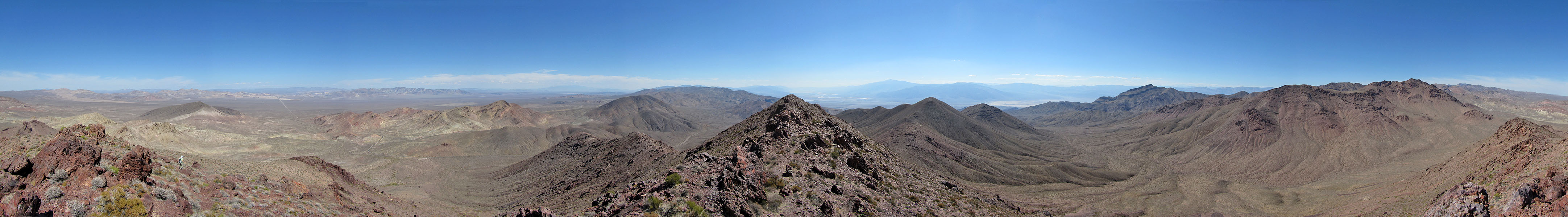 We were looking for a short climb to break up the three-hour drive from Las Vegas to Stovepipe Wells in Death Valley, and Daylight Peak fit the bill. It's about half an hour from Beatty, Nevada, which, in turn, is two hours west of Las Vegas. If you can find your way to Daylight Pass on Highway 374, then you should have no trouble finding your way up Daylight Peak. The mountain can be ascended just about anywhere from the pass, but to make the most of it, we followed the east ridge to the summit and then descended the east slopes. Rock outcrops along the ridge made the trip more interesting than a mere walk-up, while the Funeral Mountains to the east and the Panamint Range to the west caught our attention. And below, of course, was central Death Valley.