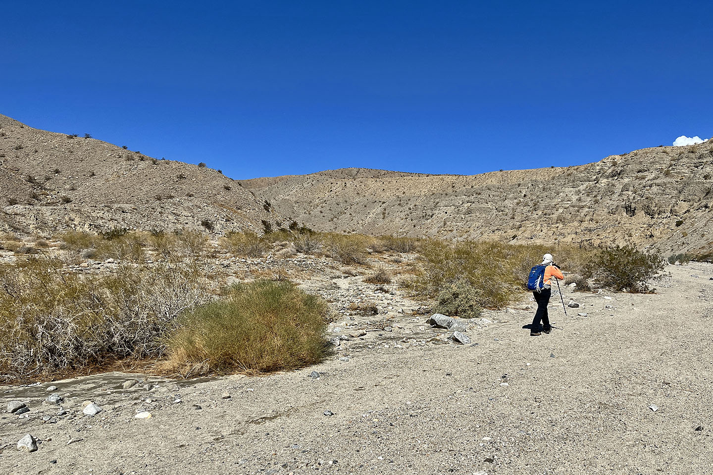 We continued up the sandy wash as it hugged a slope on the right. 2 km from the oasis, the wash, now very broad, split and we kept right. After trudging another 500 m, we found the trail that climbs the ridge. We stopped as half a dozen hikers came down.