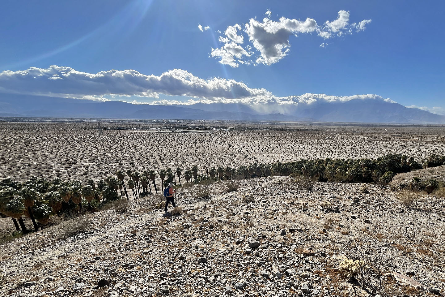 We followed the long, gentle south ridge. With far-reaching views in front of us, we appreciated doing the loop clockwise. Near the end of the ridge, the trail drops into the palms oasis. We enjoyed seeing the trees once more before finishing the hike.