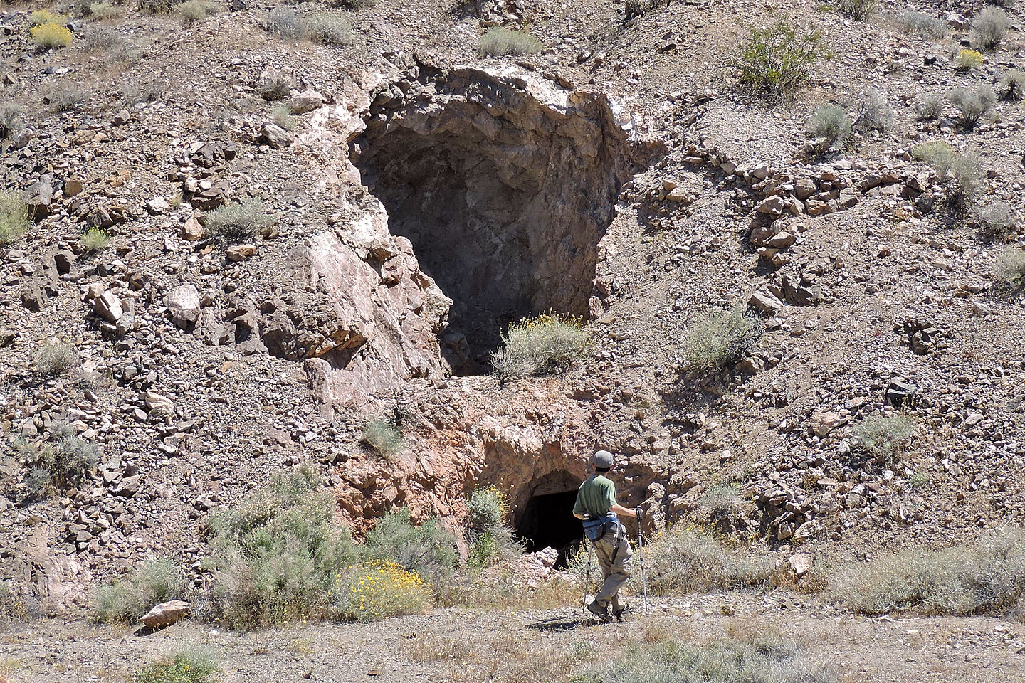 We dropped down to the south col and then made our way down a wash. Narrow and rocky at first, the wash eventually eased into a broad, gravelly floor. When we spied tailings on our left we knew we had reached the mine. Above the tailings we found a mine entrance with a signpost that read “New American Mine.”