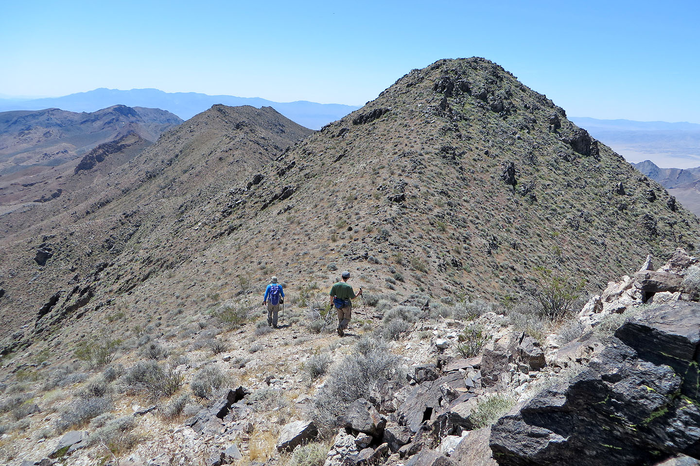 The old road was obvious until it dropped down into a wash on our right. We stayed in the wash until the road reappeared and climbed up the lower slopes of Ibex Peak. Just before the road reached a pass, we set off up the northeast ridge. The ridge takes in a few minor bumps before curving around to meet the apex of Ibex. We didn’t stay long on the summit as we were soon covered in tiny flies. They didn’t bite, but they sure were annoying. We took photos, signed the register (last signed exactly one year ago), and fled down the other side of the ridge. We had lunch in a quiet spot among the rocks.