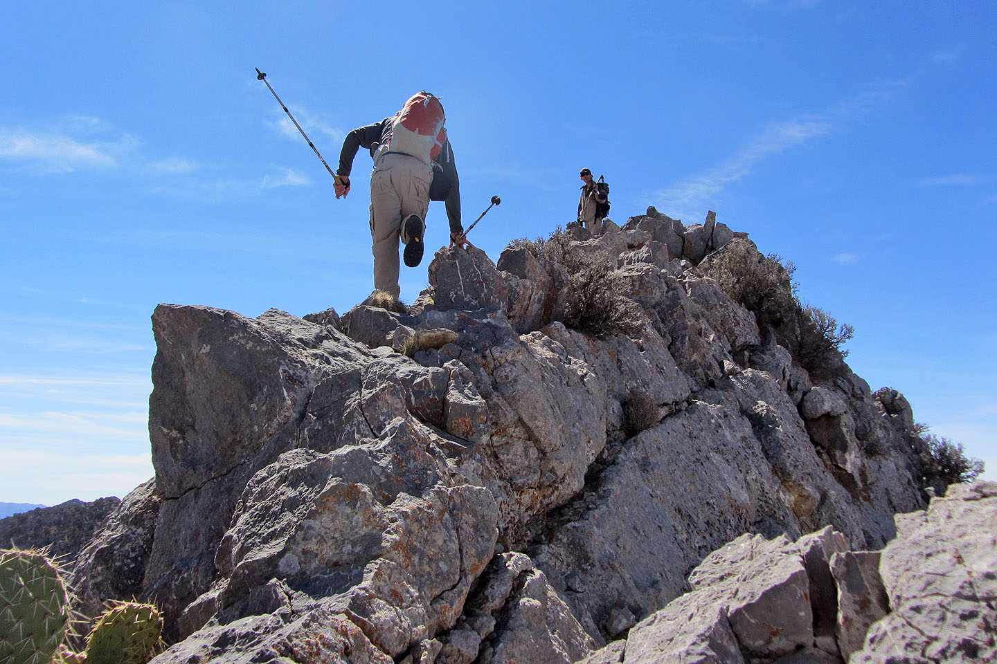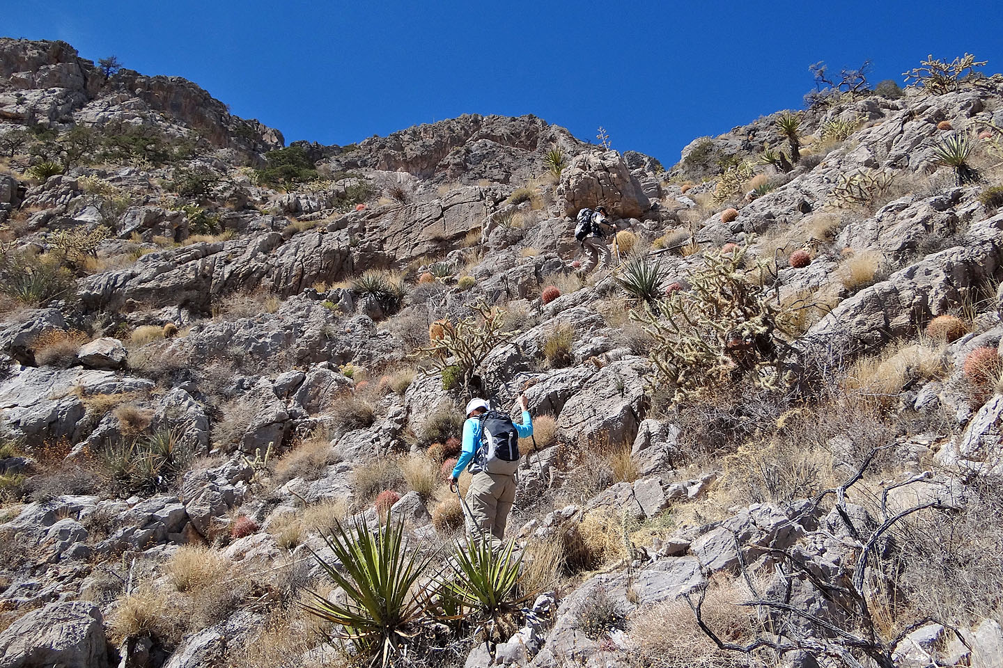 The route wasn't easier once we reached the ridge. Not only did steep rock hamper us, but Mitchell's superabundance of prickly plants conspired to block simple routes. Shin, comfortable with desert travel, slipped through the cactus plants and catclaw trees almost unscathed, while Dinah and I, primed with bushwhacking in Canadian Rockies and used to bulldozing through vegetation, repeatedly impaled ourselves on cactus needles and catclaw thorns. So the steep rock and plethora of prickly flora hindered our progress along the ridge. Nor did it help that Dinah suffered from a cold. When we reached an exposed ridge, she decided to hang back.