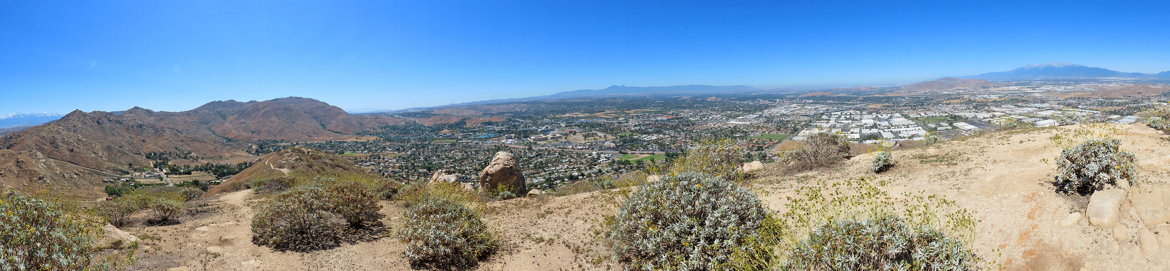 On the summit, I had a grand view of distant peaks. I could see 3500 m San Gorgonio Mountain to the northeast, still covered in snow. Then I followed the trail down to join Dinah on the lower slope, and we completed our little hike. It's nice to know that in the bustling city of Riverside, tranquility can be found on Sugarloaf Mountain.
