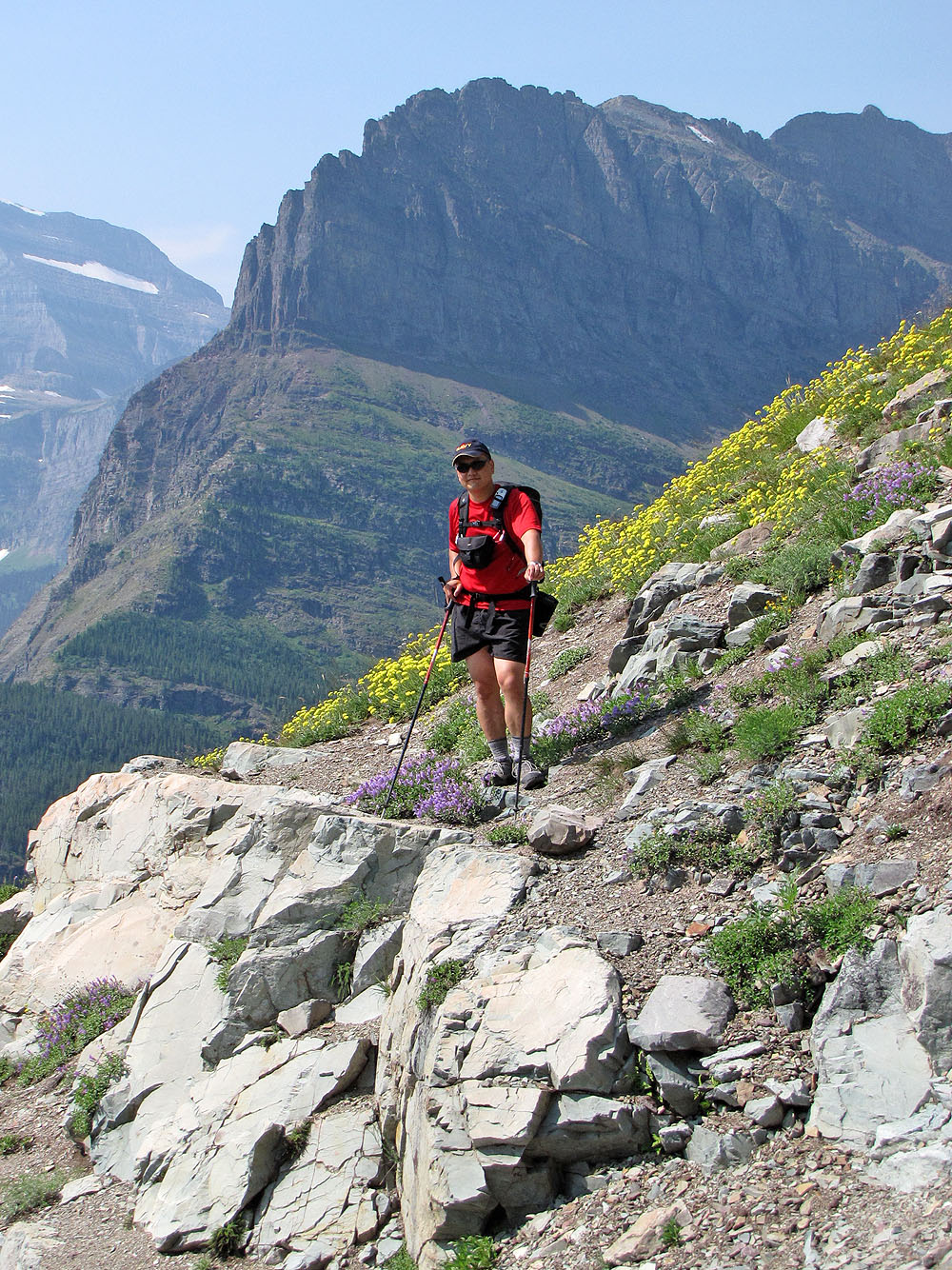 We had no trouble finding the trailhead: it's just past the junction at Swiftcurrent Falls. We parked at a pull-out past the trailhead. The steep, unrelenting trail follows alongside a drainage that cuts through a cliff band. Past that, open slopes stretch to a cliff band below the summit ridge.