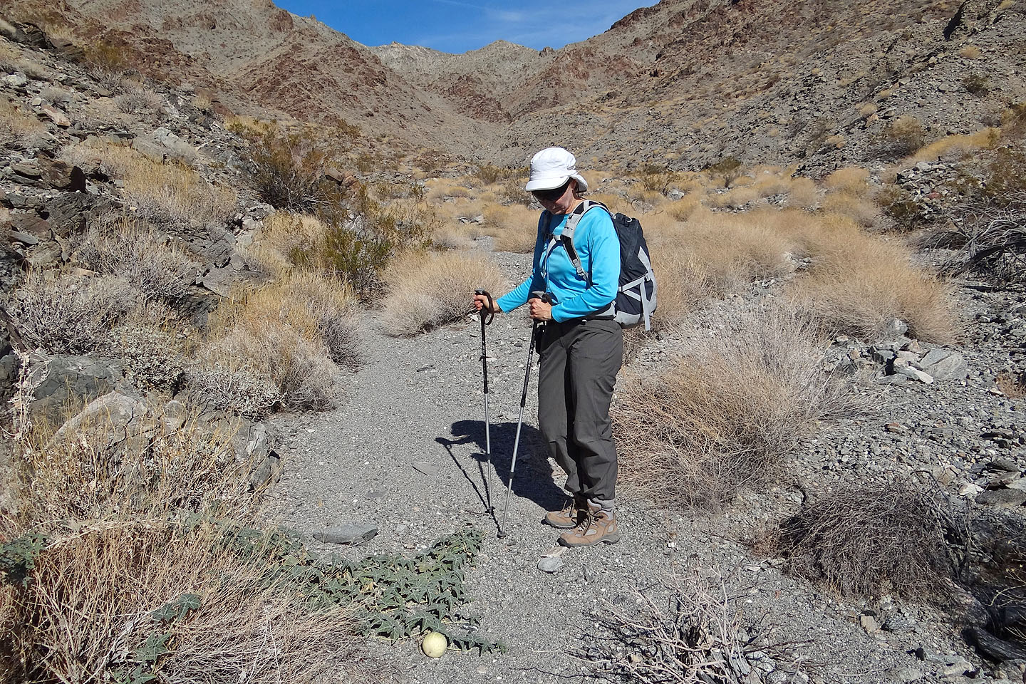 Just before reaching the saddle my lower leg accidentally bumped into a teddybear cholla cactus. There is nothing cuddly about teddybear cholla (pronounced chohl-ya). Of all cactus encounters, we're most apprehensive of this one. The spines are so sharp they can sink into the hard rubber at the end of a hiking pole. The cactus clings firmly like Velcro with needles, sticking to anything it touches. I once pulled out a cholla spine that was stuck a quarter of an inch in my shoulder, and it so resisted removal that it formed a quarter-inch volcano of skin as I tugged on it. But never does the plant offer up just one spine. As a way of propagating, stem segments break off easily, so when I knocked against the cactus, a three-inch piece was nailed to my lower leg. And since segments have densely bristled barbs, they leave no surface to grab. To extract the spines from my leg, I carefully pulled my pant leg away from my leg. The cactus was so firmly embedded that the process took a half-minute of slow, steady force – with pauses to catch my breath for the pain. Once clear of my leg, I used a forked stick to tug the segment free from my pants. When I pulled up my pant leg, I saw that my leg was swollen and had maybe two dozen puncture wounds. As you might guess, I was more careful with the cholla cactus after that.
