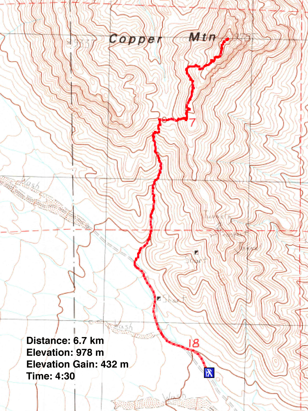 I came across Copper Mountain on Harlan Stockman's website, and even though his web page was sorely lacking a route description, Dinah and I were enticed to try it. (He has a link to a Summitpost posting, but that page is no longer extant.) The way up Copper appeared straightforward: just follow the south ridge. However, we wished to avoid the class 4 downclimb near the start of the ridge, so we decided to ascend a wash and gain the ridge midway.