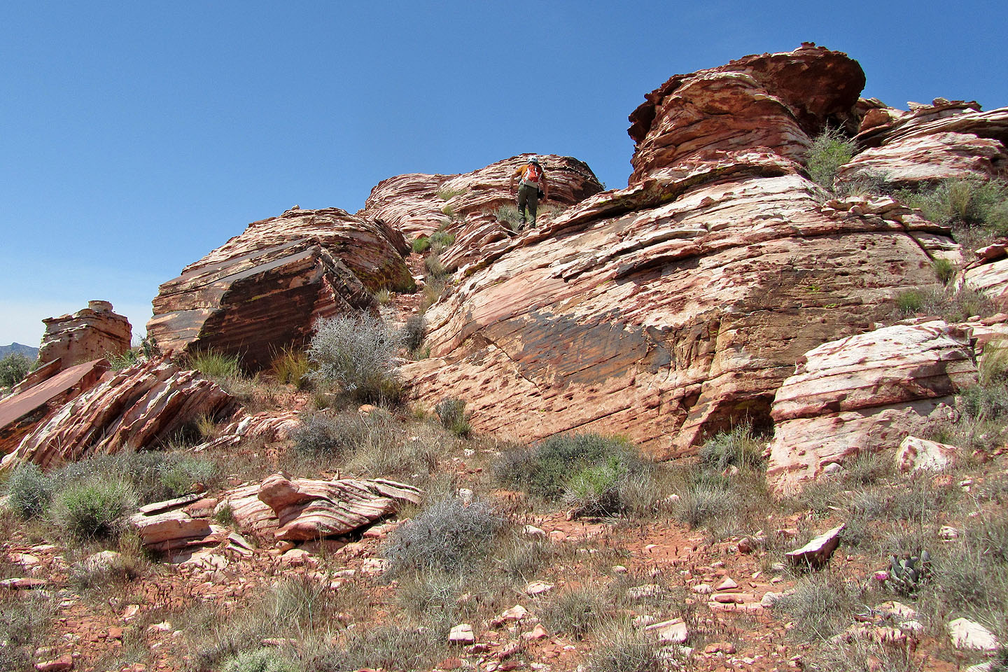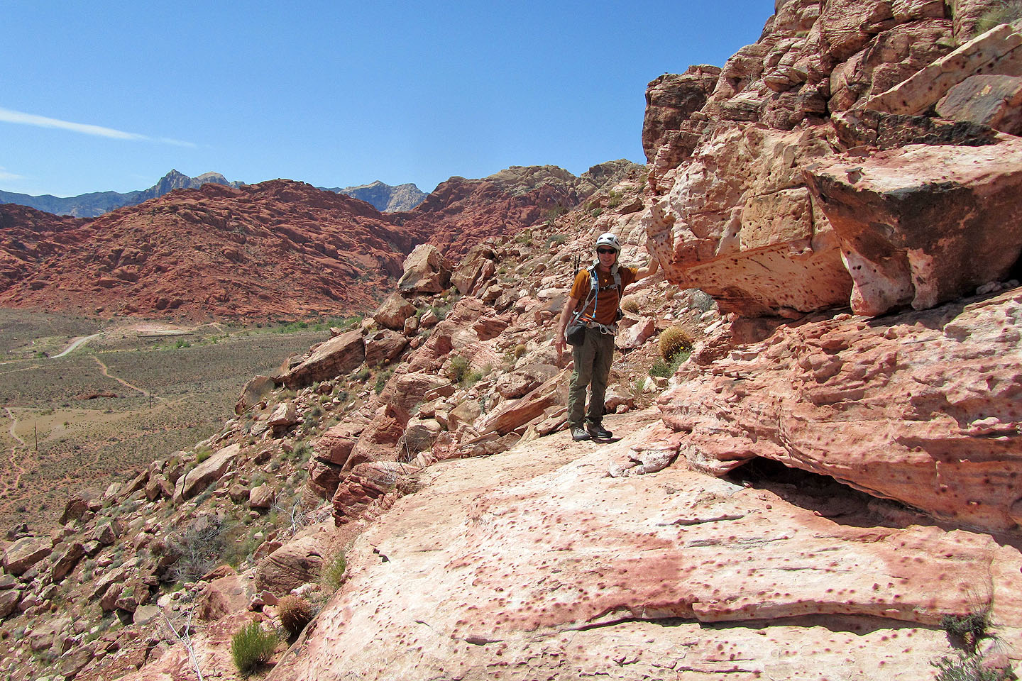 When we met our friend Nish afterwards, we told him we had climbed Kraft, and asked if he had done it. At first he was reluctant to talk about it, but after some chiding, he gave in. Nish had climbed the mountain in the evening with the Las Vegas Meetup. Although inexperienced at the time, confidence surged within him when he discovered a descent route after they summited. Excitedly, he quickly descended until suddenly he ran out of negotiable slope. Not only was it too steep to continue down, but with nightfall descending, it was too dangerous to climb back up! Much to his chagrin, he had to be rescued.
