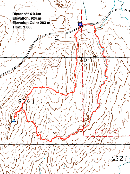 After a short summit stay, we backtracked a bit before starting our descent to a red sandstone watershed. The watershed is at the head of two washes: one running north and the other south. The north wash leads to the wash we used on our ascent.