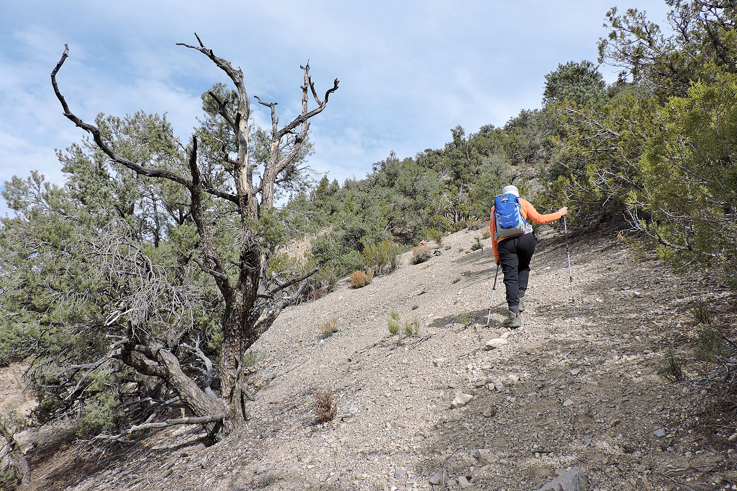 The dirt road, Logan Canyon Road, begins with an unlocked cattle gate and requires a high-clearance vehicle after passing petroglyph sites. Shin, Dinah and I drove to the pass. After parking, we walked up a short road to the base of a wooded slope.