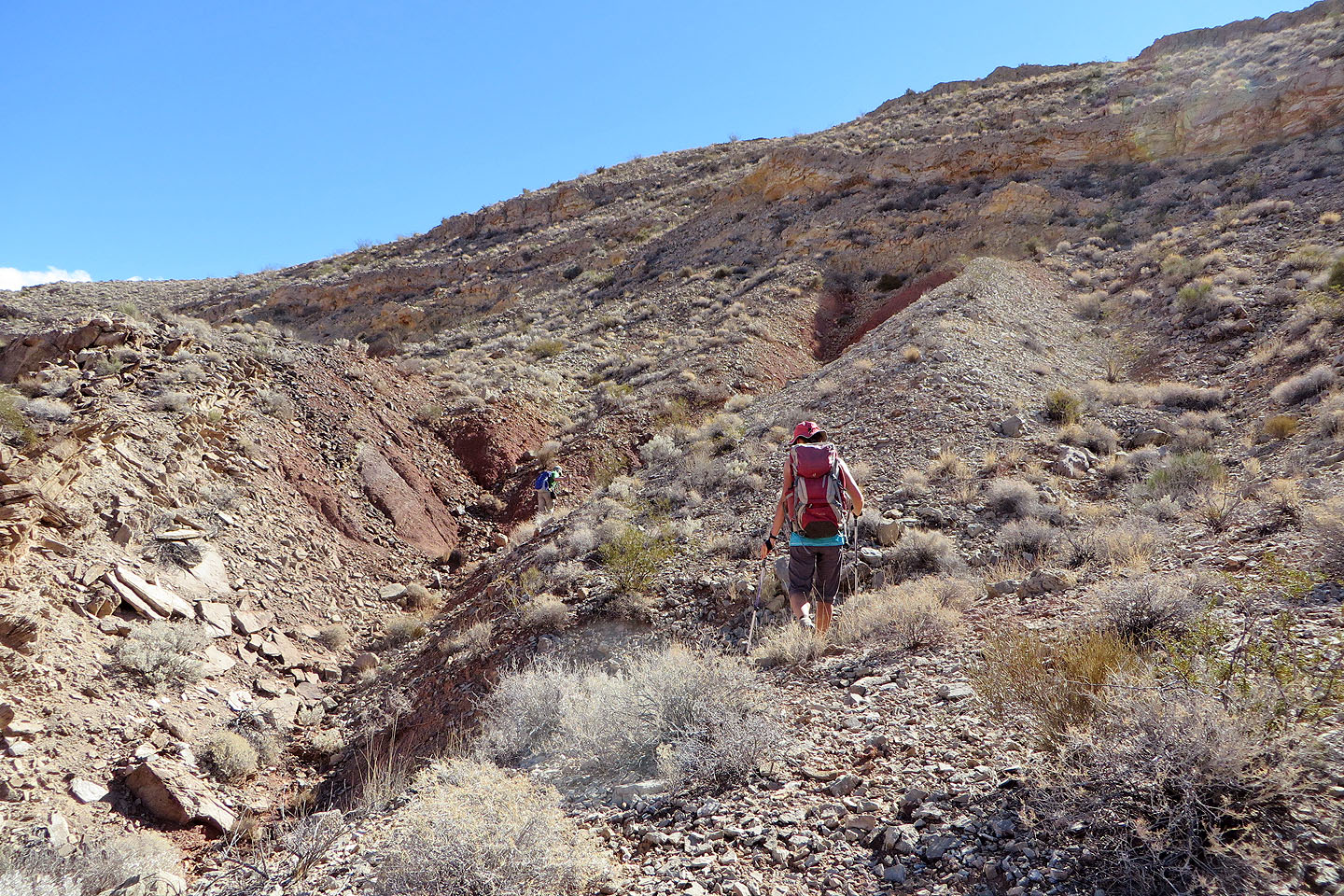 Joining Dinah and me for this trip were Sonny and Zosia. Dinah and I had flown in from Calgary, while Sonny and Zosia drove down for a two-week hiking spree in the U.S. After meeting in Las Vegas, we drove to the trailhead in Lake Mead to a pullout just past mile marker 18. A short trail dropped us into Cottonwood Wash.