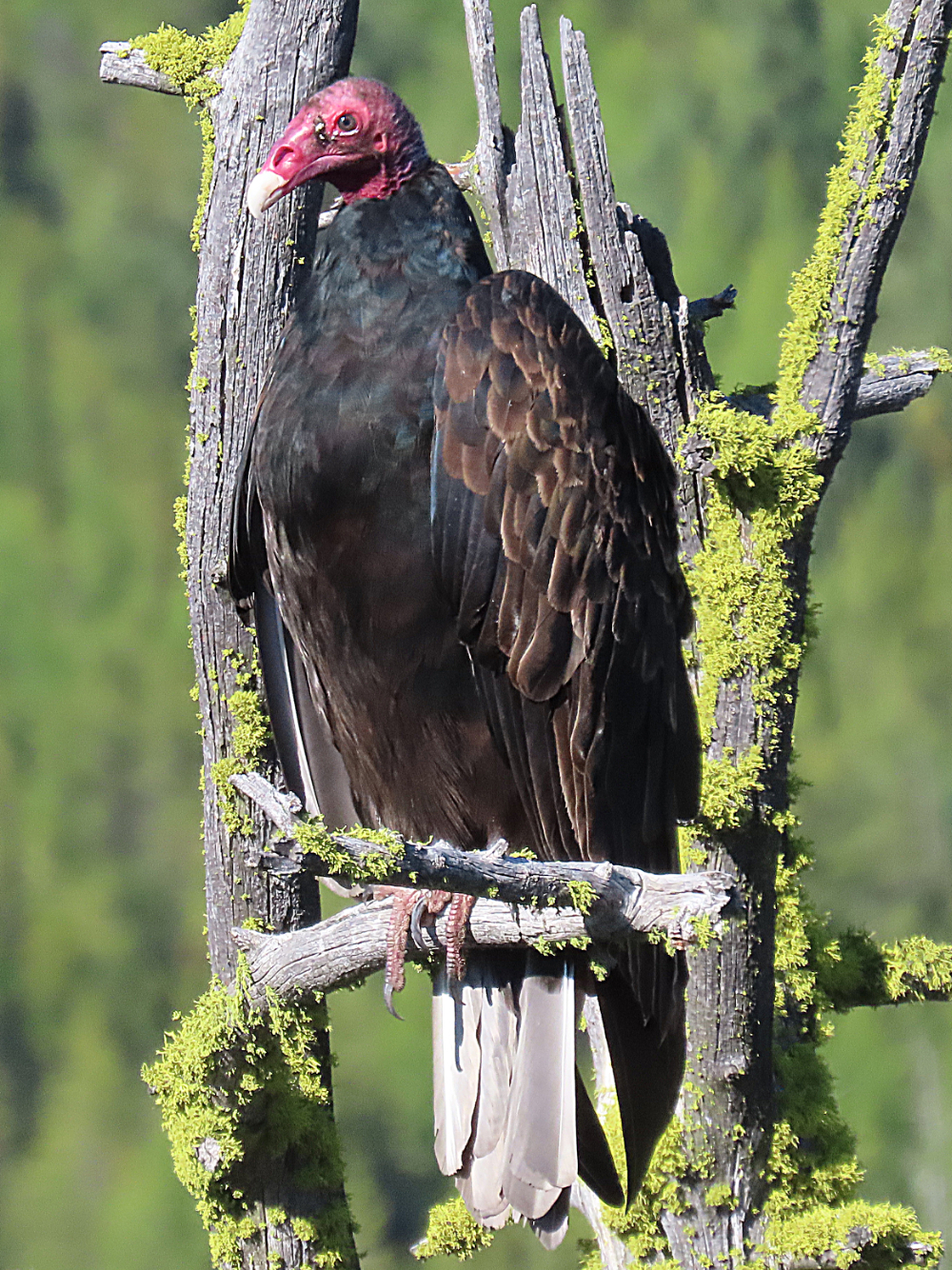 After driving several kilometers up a gravel road, high ground clearance not required, we parked at a small pullout and started up a quiet forest road. Larch trees were just starting to show a hint of colour change, but were a week or two from turning vivid yellow. The road gently climbed, but after passing two forks, it became slightly steeper. The forest thinned, but there were no views until just below the summit. The road ended, and we followed a brief path to a viewpoint with a little bench. Near the bench, we were surprised to see a turkey vulture perched in a tree a few metres away. I snapped a few photos before the big bird became annoyed and flew away.