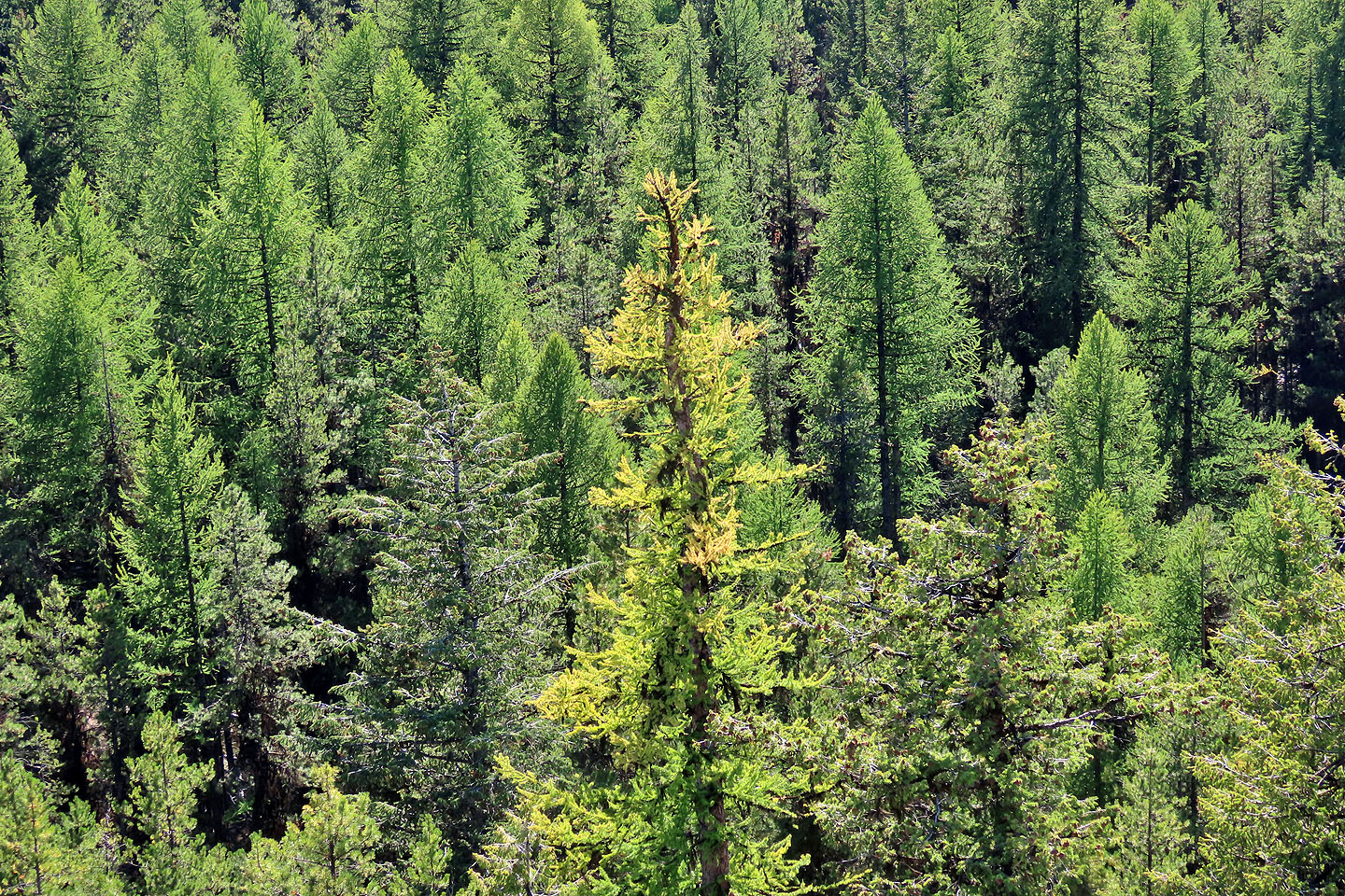 A solitary larch tree turning yellow was a harbinger of fall colours to come (mouse over to zoom back)