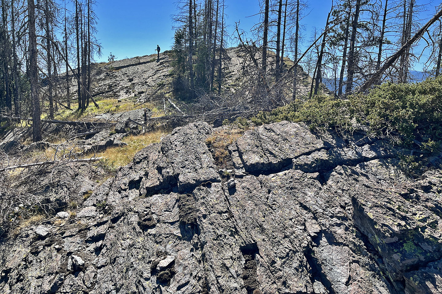 The summit was a short distance away. There’s no trail, but we easily crossed rock slabs to reach the top. As expected, there was a 360° view. However, trees prevented us from looking down at New Lake, and wildfire smoke veiled distant views. Despite this, it was a pleasant trip, and we lingered on the summit before heading back down.