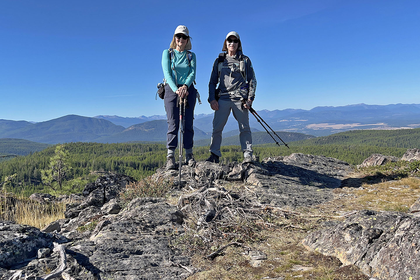 From a summit bench, Dinah looks down at the City of Cranbrook. Mount Baker in the centre.