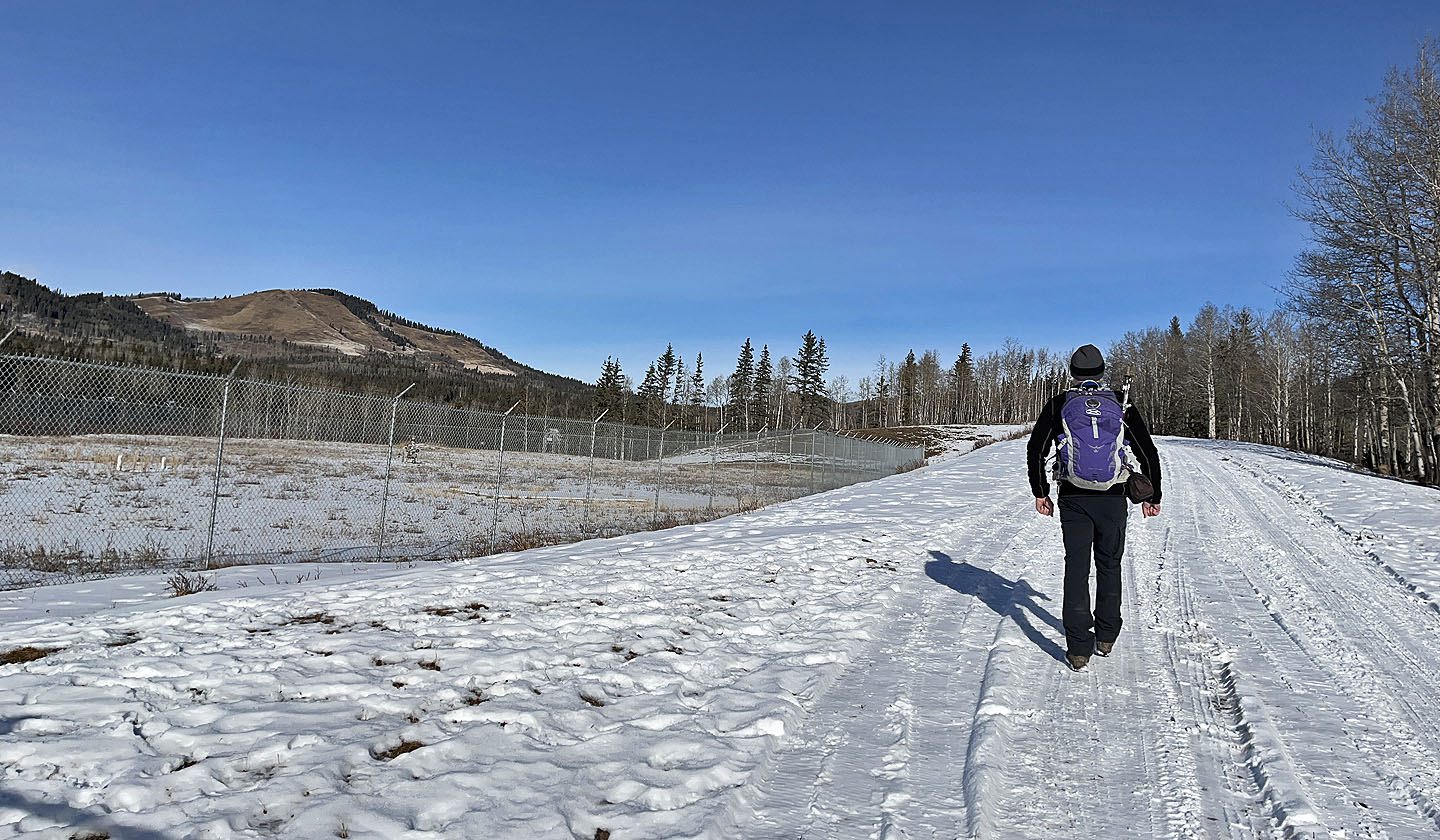 I continued south down the trail and passed a clearing with a view of Mesa Butte before re-entering the woods. Due to snow, the trail was difficult to follow in places, but flagging and footprints in the snow helped keep me on track. The trail exits the forest and crosses an immense meadow. At the end of the meadow, it merges with the well road 350 m from the gate. Muffet’s Hill is a nice, brief hike, but a longer trip could be made by adding Jack’s Hill.