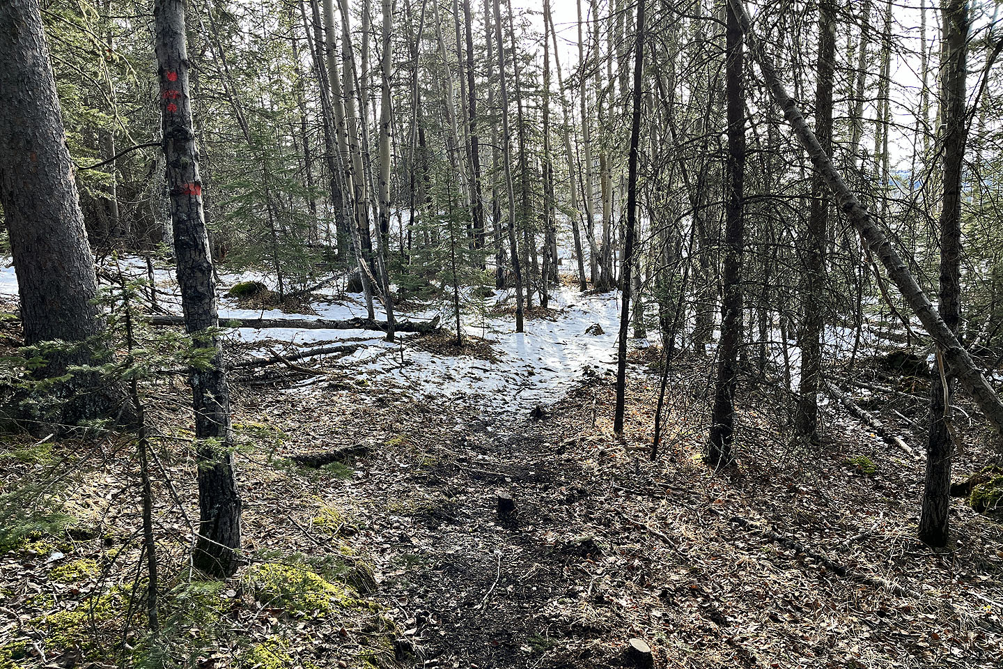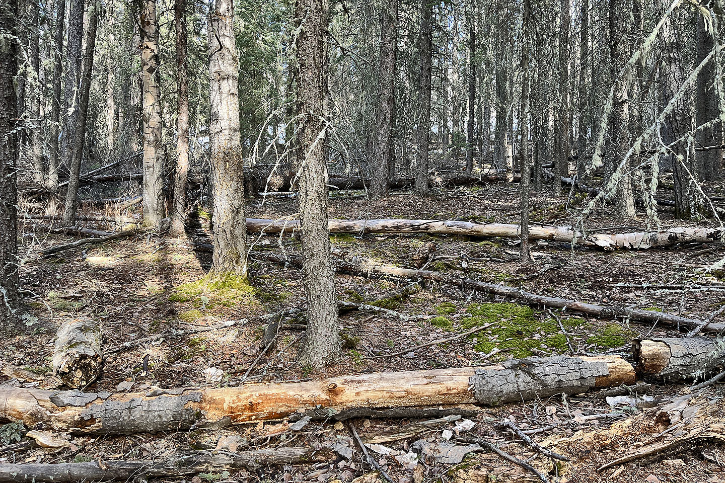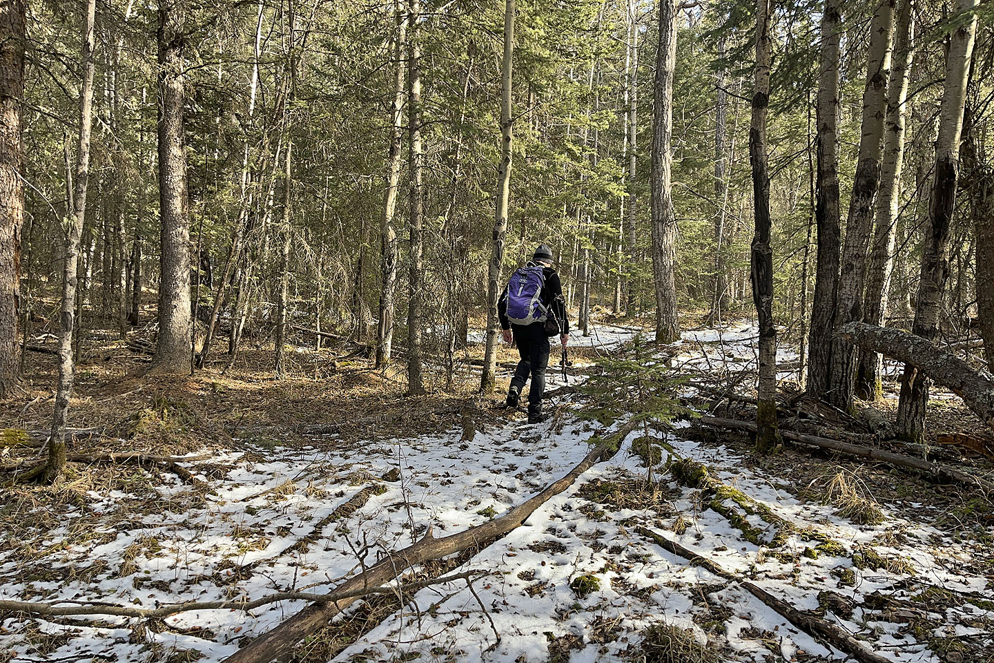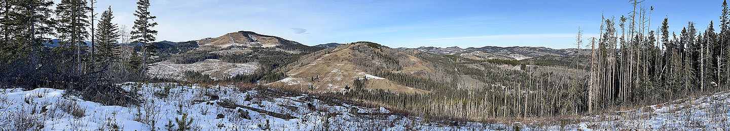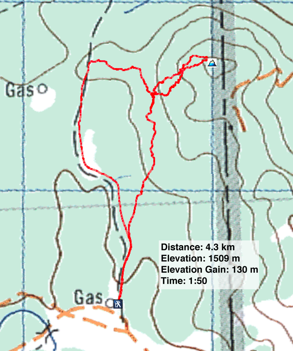 After parking at a gate, I walked up the well road. On an open rise 1.4 km from the gate, I turned onto Mesa Back Door Trail, which headed to the foot of Muffet’s Hill. The trail soon turned south and entered the forest. The trail climbs, but before it descended, I exited. I bushwhacked easily up the wooded slope and crossed a couple of glades. I kept left, knowing I would hit a cutblock that led to the summit. Muffet’s top is partially ringed with trees, but I had a fine view of Mesa Butte and Jack’s Hill. After looking around, I descended and returned to the trail.